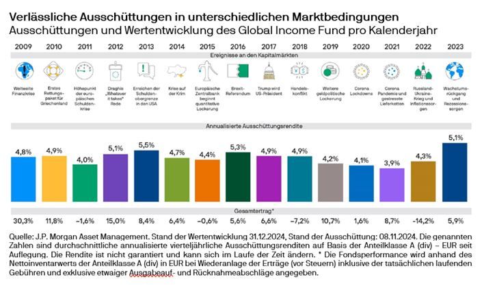 In einer Zeit, in der Anlegerinnen und Anleger nach verlässlichen Erträgen suchen, setzt der JPMorgan Investment Funds – Global Income Fund seit 17 Jahren Maßstäbe. Die Strategie, die bereits seit 2007 in den USA erfolgreich umgesetzt wird, und im Dezember 2008 in Europa startete, hat sich als eine der führenden Multi-Asset-Income-Lösungen etabliert. Mit einer aktuellen annualisierten Ausschüttung von 5,13 Prozent (Anteilklasse A (div) – EUR, Stand November 2025, Ausschüttung nicht garantiert) und einer positiven Wertentwicklung von 7,7 Prozent im laufenden Jahr bleibt der Fonds auch 2025 ein starker Baustein für ertragsorientierte Portfolios. Damit bestätigt der Income-Klassiker seine Rolle als zuverlässiger Ertragslieferant – und das in einem Marktumfeld, das weiterhin von Unsicherheiten und schwankenden Zinsen geprägt ist.