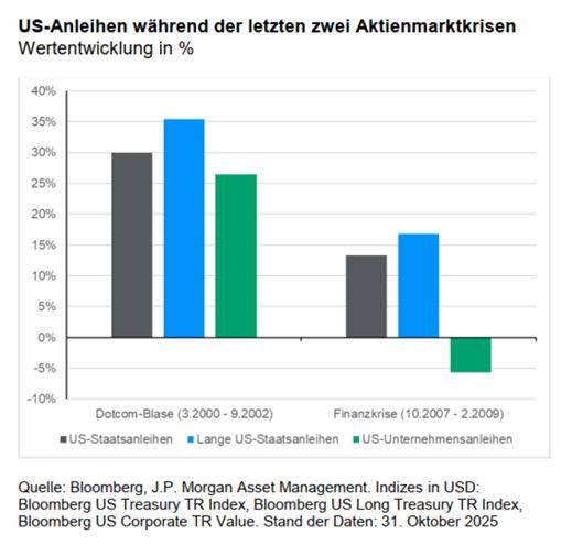 Hochwertige, langlaufende Anleihen könnten aus Sicht von Tilmann Galler im Falle einer technologischen und KI-gesteuerten Krise, die wahrscheinlich zutiefst disinflationär wäre, ein „nützlicher Airbag“ für das Portfolio sein. „Falls die Nachfrage nach KI-Infrastruktur überschätzt wird und die Renditen enttäuschend ausfallen, sind Überkapazitäten, sinkende Preise, schrumpfende Margen und reduzierte Investitionen zu befürchten. Die Aktienkurse würden einbrechen, das Verbrauchervertrauen sinken, und die Investitionen in den Privatsektor zurückgehen“, erklärt Galler.