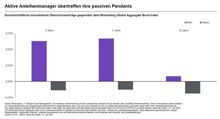 Aktive Anleihenmanager können die Duration steuern, auf Bonitätsveränderungen reagieren und ihre Allokationen gezielt an Marktphasen anpassen – etwa, indem sie auf attraktiv bewertete Segmente oder Regionen umschichten. Die Vorteile des aktiven Managements schlagen sich auch in der Performance nieder: Bei Kernanleihenstrategien, die sich am Global Aggregate Bond Index orientieren, konnten aktive Manager ihre passiven Pendants über drei-, fünf- und zehnjährige Zeiträume hinweg übertreffen, so die Analyse von J.P. Morgan Asset Management.