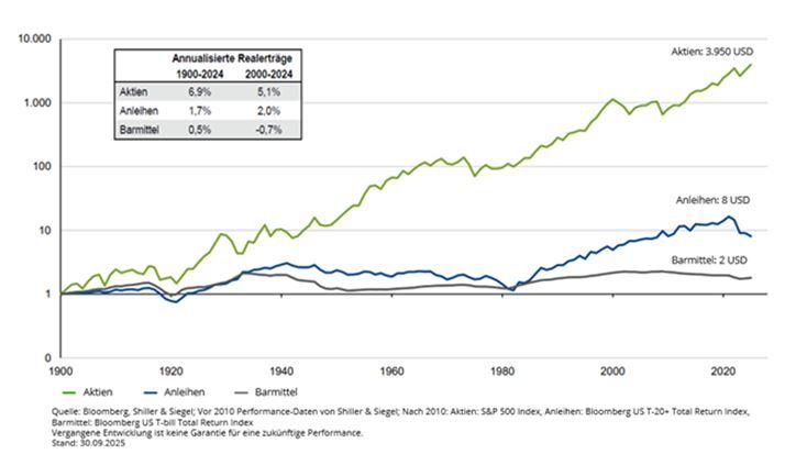 Wie kraftvoll diese Mechanismen wirken, zeigt ein langer Blick zurück. Aktien – gemessen am US-Leitindex S&P 500 – erzielten seit 1900 einen aufs Jahr hochgerechneten Realertrag von 6,9 Prozent. Langfristige US-Staatsanleihen kamen auf 1,7 Prozent, kurzfristige Geldanlagen sogar nur auf 0,5 Prozent. Über mehr als 120 Jahre hinweg wurde so aus einem in Aktien investierten Dollar trotz aller Finanzkrisen ein Vermögen von 3.950 Dollar. Aus demselben Dollar wären in Anleihen nur acht Dollar geworden und in Barmitteln sogar lediglich zwei Dollar.