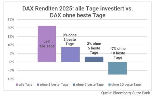 Der DAX erzielte 2025 eine Gesamtperformance von 21,3 Prozent. „Auf den ersten Blick ist das ein sehr erfreuliches Ergebnis“, sagt Mathias Beil, Leiter Private Banking der Sutor Bank. „Doch unsere Analyse zeigt, wie fragil dieser Erfolg ist, wenn man zum falschen Zeitpunkt nicht investiert war.“ Wer die drei besten Börsentage des Jahres verpasste, erzielte nur noch eine Rendite von 8,9 Prozent – weniger als die Hälfte. Bei fünf verpassten Tagen schrumpfte die Performance auf 3,1 Prozent, bei zehn verpassten Tagen rutschte der DAX sogar ins Minus: -7,4 Prozent.